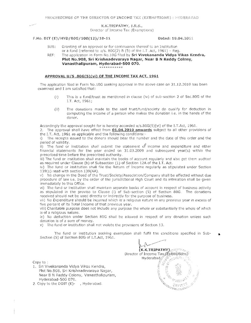 Donations made are exempt from Tax under Section 80G of the Income Tax Act, 1961 vide F. No. DIT(E)/HYD/80G/100(12)/10-11, dated 19.04.2011 w.e.f. 01.04.2010 onwards